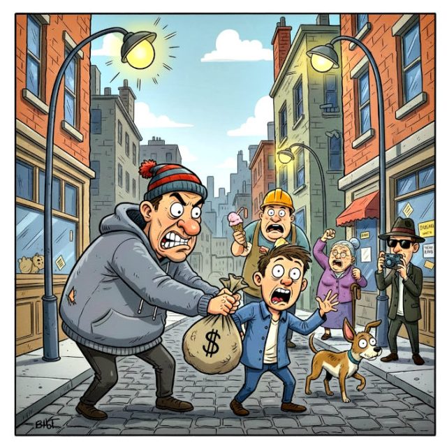 Em forma de de parábola, começa com um assalto, um tiro, o assaltado ao solo.